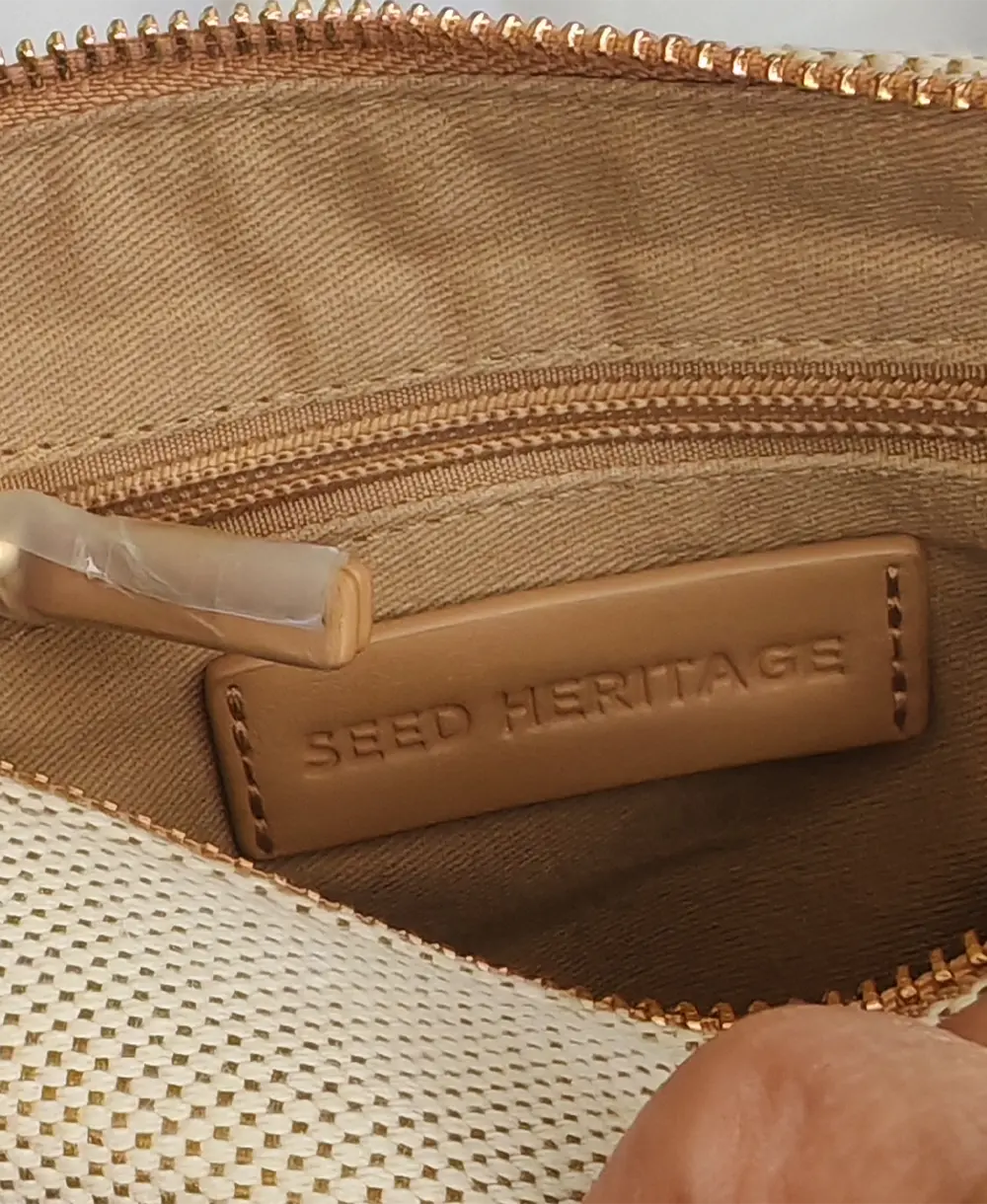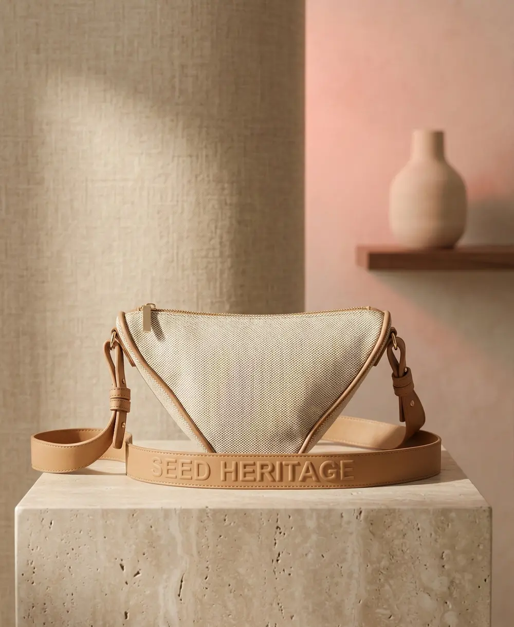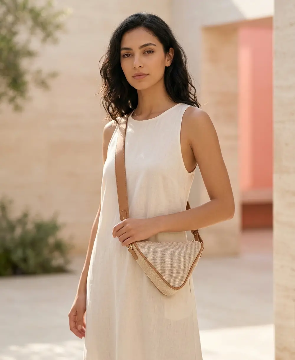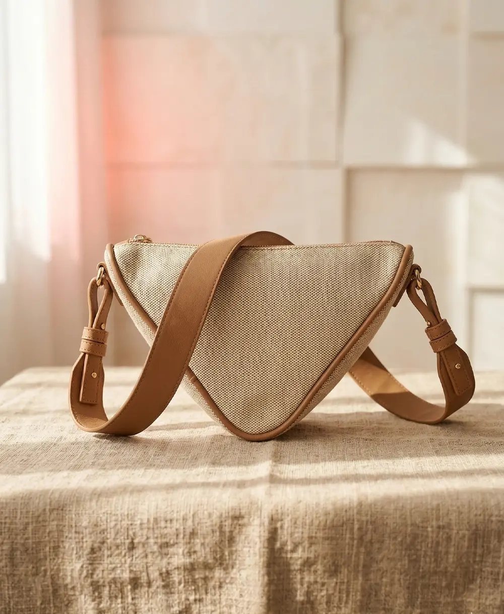 Un modelo extrovertido y súper cómodo que no pesa nada. Presenta una forma triangular muy original en lona beige súper ligera. Viene con una elegante cremallera dorada y correa que puedes ajustar a tu gusto. Condición: 10/10 (Como nuevo). Medidas: 24 x 15 x 9 cm.