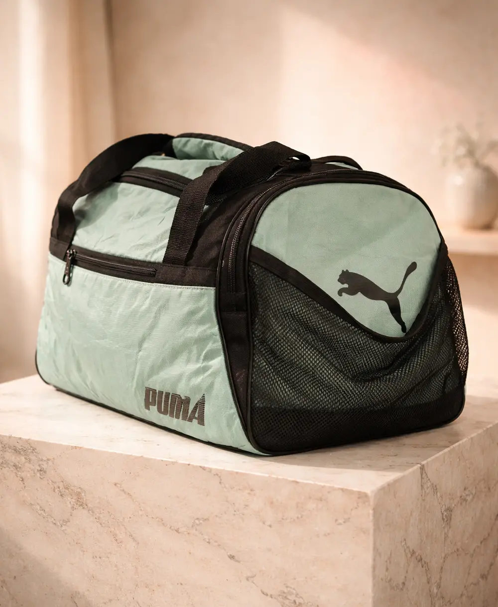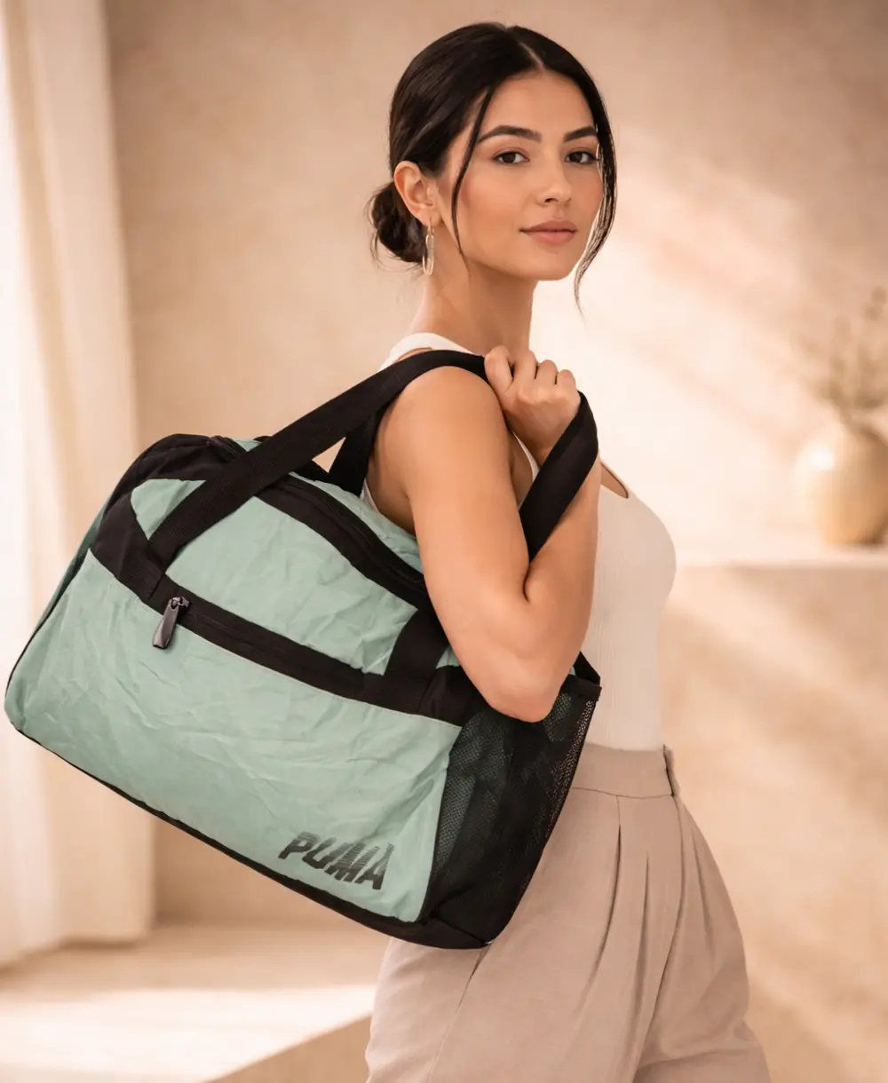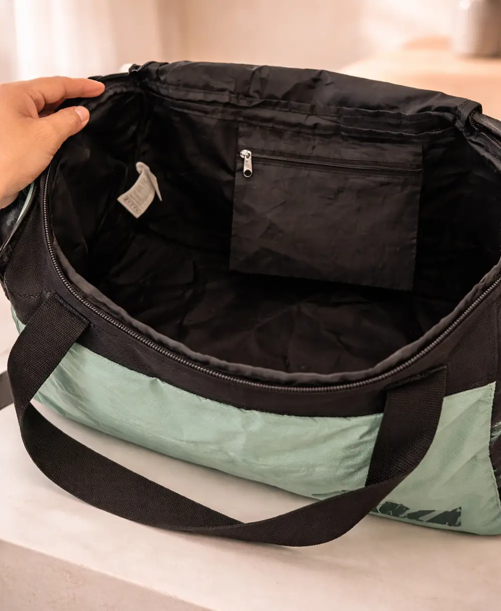 Frescura y capacidad sin límites para moverte. Este bolso deportivo te encantará con su moderna combinación de tela en color verde menta y negro. Viene con forro interno y un bolsillo pequeño para tus esenciales, siendo la opción ideal para tus entrenamientos o escapadas de fin de semana. Condición: 9.5/10 (Excelente), se encuentra en muy buen estado general sin desgastes visibles, aunque no es una pieza nueva. Sus medidas son 49 x 28 x 26 cm.