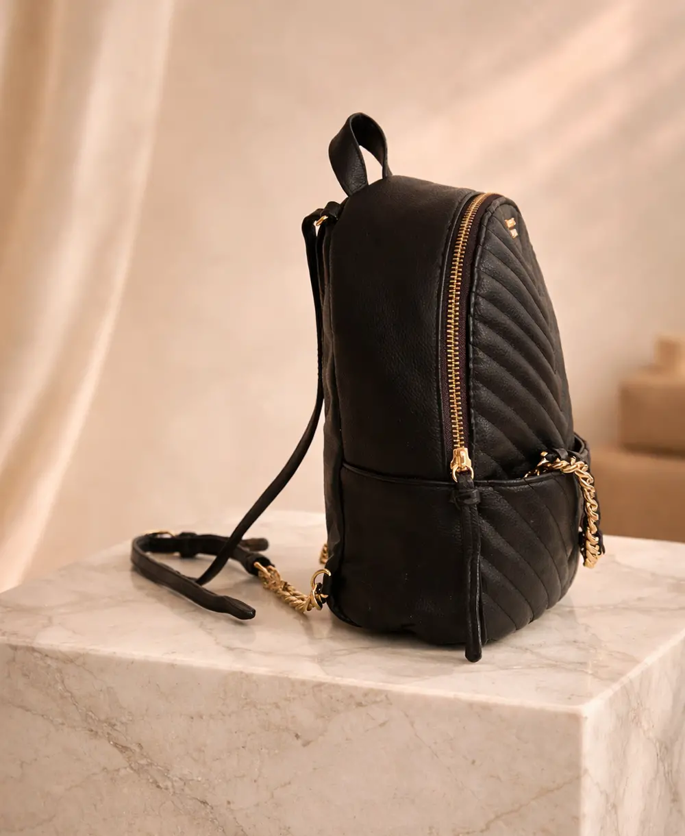 El accesorio joya en formato mini. Elaborada 100% en PVC con forro interior estampado, resalta por su delicada cadena dorada y cremallera a juego. Condición: 10/10 (Como nuevo), se encuentra en un estado impecable. Medidas: 19 x 23 x 9 cm.