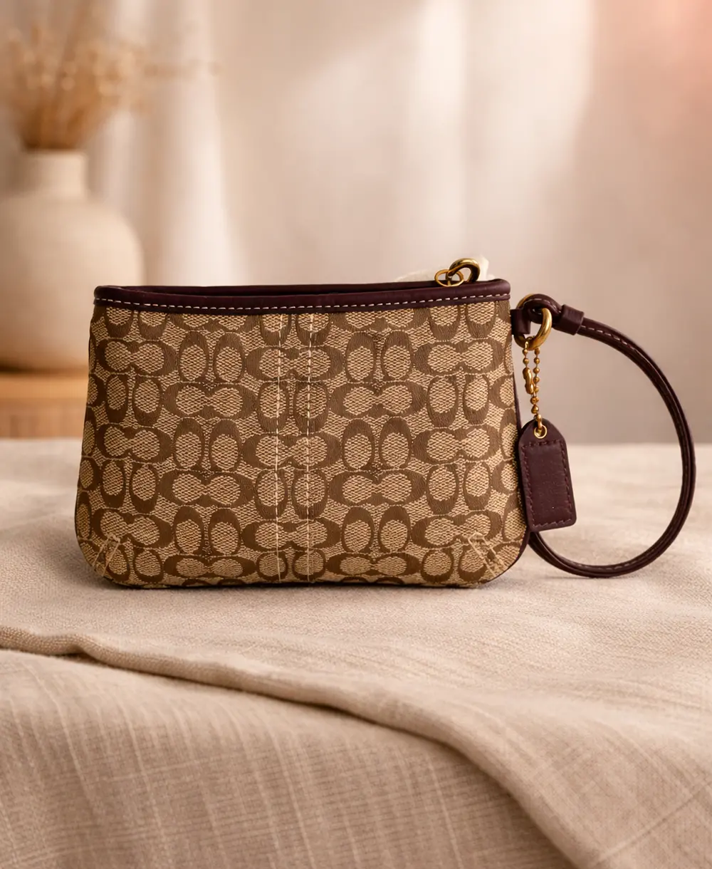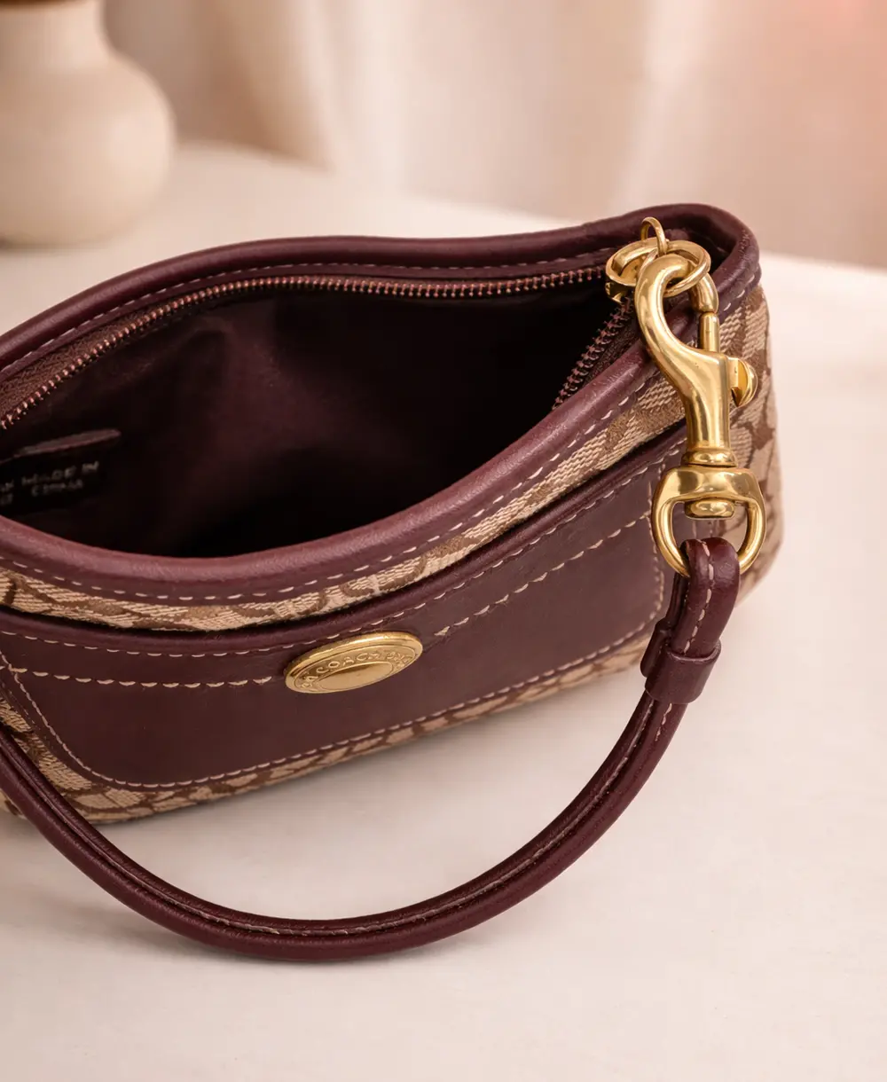 Un tesoro clásico con mucha historia. Esta coqueta muñequera combina cuero real y lona en tonos morado y marrón, realzada por herrajes dorados brillantes. Ideal para llevar estrictamente lo vital. Condición: 9/10 (Muy Bueno), presenta un leve raspón en su placa frontal dorada. Medidas: 17.5 x 11.5 x 1 cm.