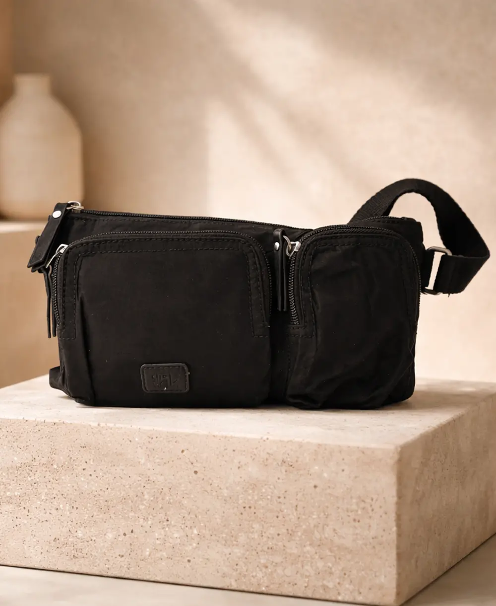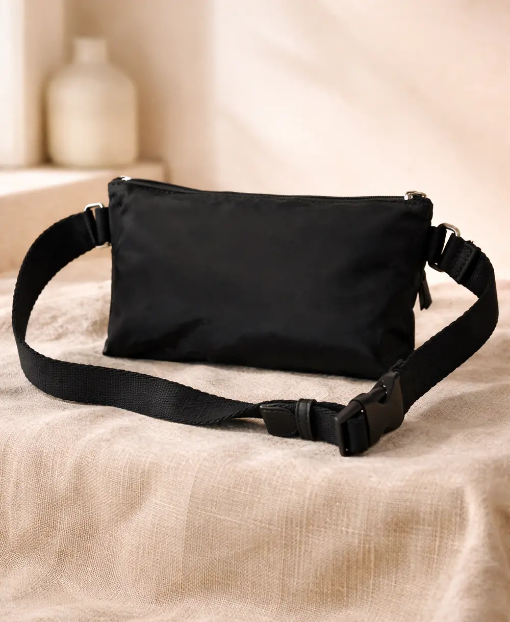 Libertad de movimiento absoluta. Esta moderna riñonera negra está fabricada en ligera lona de nylon, acompañada de detalles metálicos plateados y una correa que se ajusta a tu cuerpo. Condición: 10/10 (Como nuevo), se encuentra impecable. Medidas: 28 x 17.5 x 3 cm.