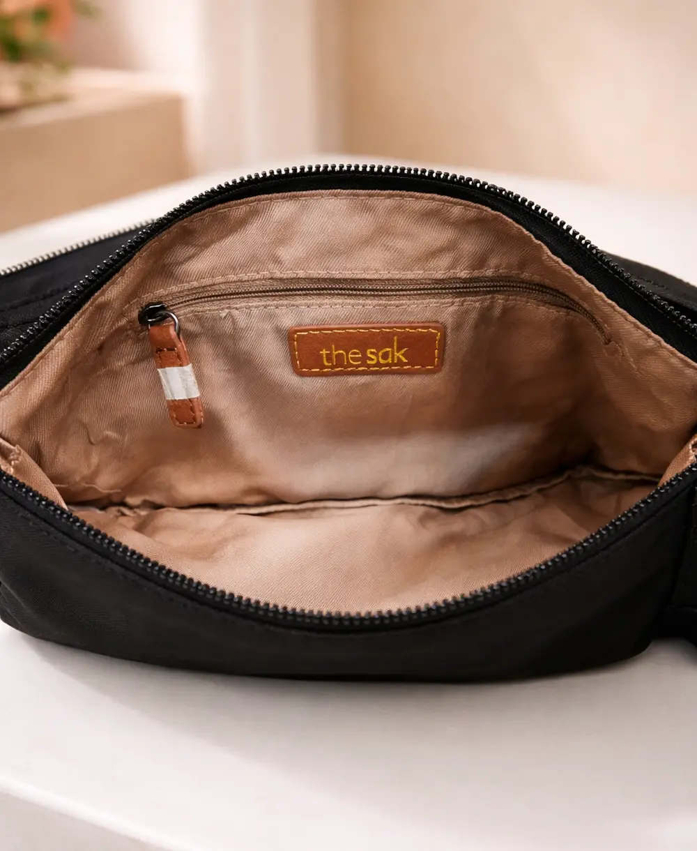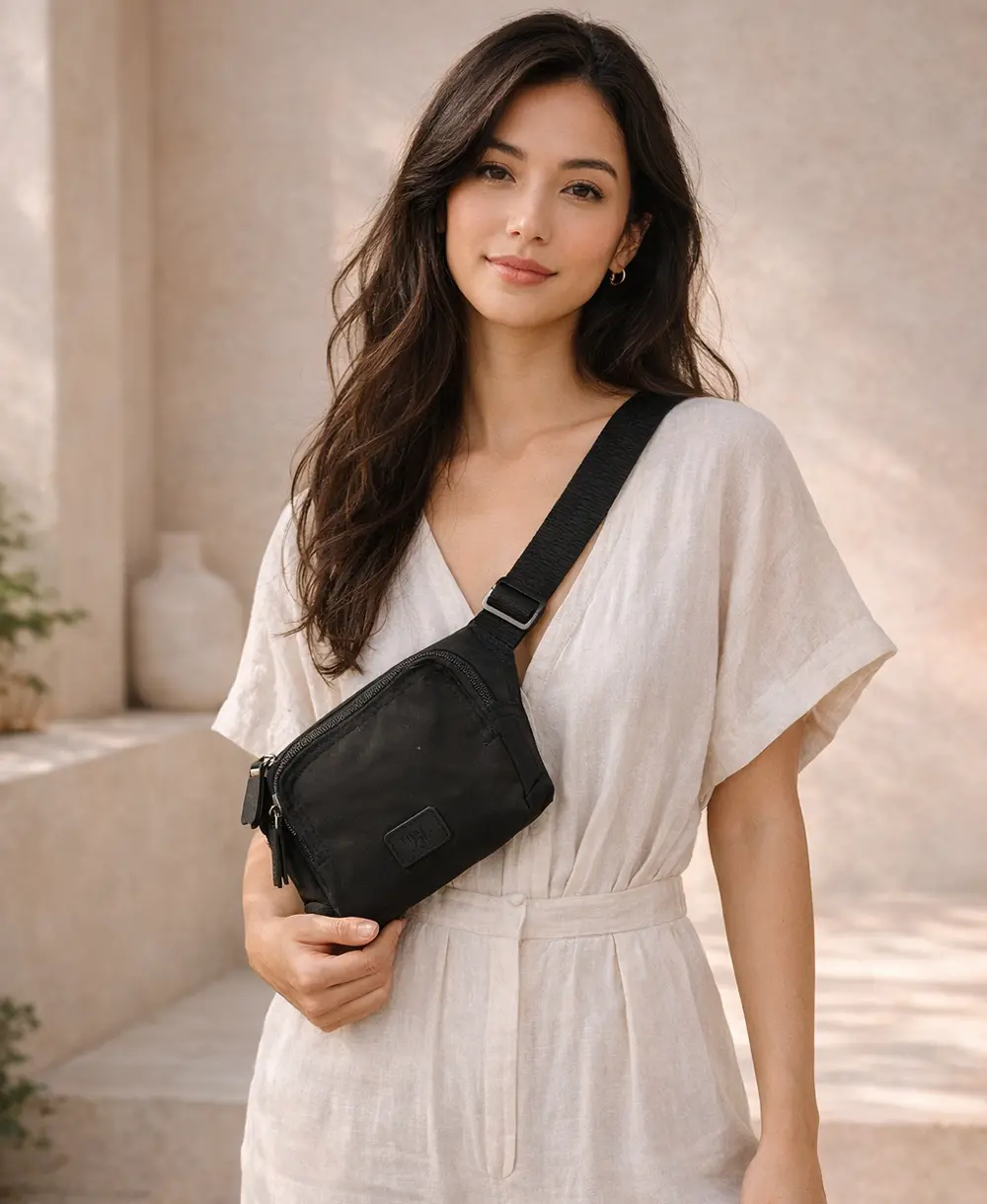 Capacidad: Tus esenciales: Cabe un smartphone, tarjetero, llaves y lentes de sol (sin estuche).